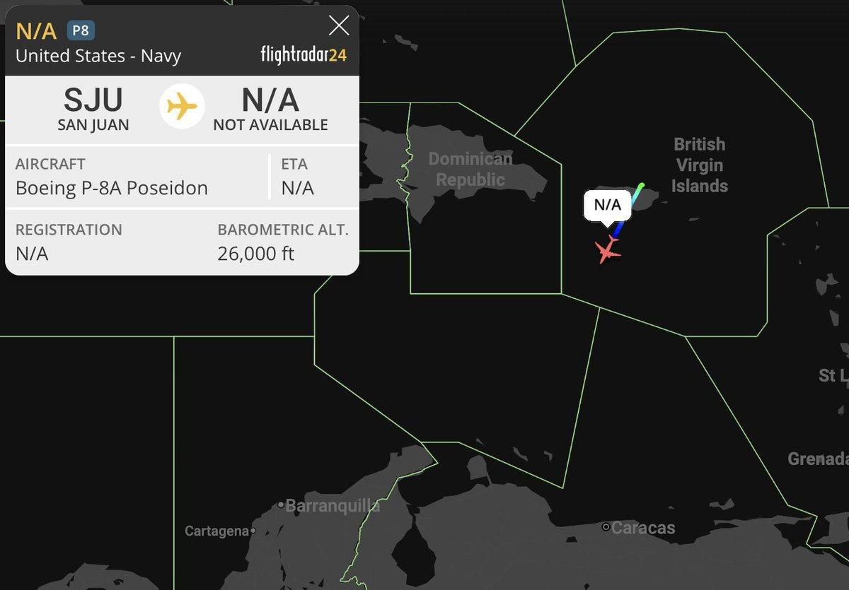 ❗️🗺В преддверии вероятного удара по Венесуэле дальний противолодочный самолёт P-8A Poseidon (hex: AE683A, позывной: MADFOX) ВМС США вылетел из Сан-Хуана для разведывательной миссии над Карибским морем. На данном этапе, задействуя многорежимный контейнерный АФАР-РЛК бокового обзора AN/APS-154, а также оптико-электронный модуль MX-20HD, экипаж "Посейдона" осуществляет мониторинг прибрежных районов Венесуэлы на предмет развёрнутых батарей береговых противокорабельных комплексов, а также батарей С-300ВМ "Антей-2500" и "Бук-М2" как с выключенными, так и с работающими на излучение РЛС обнаружения. В настоящее время машина оперирует с выключенным транспондером на высоте 26 000 футов рядом с воздушным пространством Венесуэлы. На текущий момент суммарный наряд "Томагавков", развёрнутых на подводных и надводных носителях ВМС США на рубежах применения по объектам в Венесуэле, составляет от 250 до 350 ед. + тактические КР большой дальности AGM-158B JASSM-ER в составе БК F/A-18E/F. https://dze