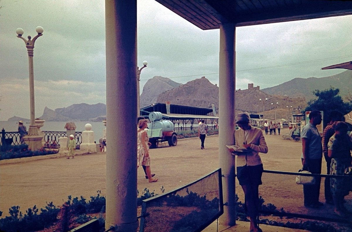 Судак. Набережная. 1964 год Бочка с квасом есть, но людей маловато, и девушка на переднем плане одета не совсем по летнему. Ранняя осень? Автор фото: Анатолий Сирота #Судак #отдых #пляж #море #общепит #ретро