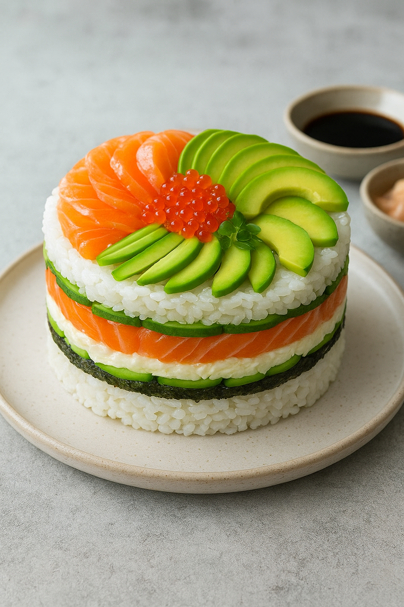Когда хочется удивить гостей или порадовать себя чем-то оригинальным, на помощь приходит кулинарное творчество. Одно из самых эффектных блюд в стиле «fusion» — суши-торт. Это не десерт, как можно подумать по названию, а оригинальная подача любимых суши в виде многослойного торта. 📌 Что такое суши-торт? Вместо привычных роллов вы получаете целый торт, где слои состоят из риса, рыбы, овощей, авокадо и других ингредиентов для суши. Нарезается он порционно, как обычный торт, и выглядит по-настоящему празднично. 🥢 Ингредиенты (базовый вариант) Рис для суши — 300 г Рисовый уксус — 3 ст. ложки Лосось слабосоленый — 200 г Огурец свежий — 1 шт. Авокадо — 1 шт. Сливочный сыр (типа «Филадельфия») — 150 г Листы нори — 2 шт. Икра тобико или красная — для украшения Соевый соус, васаби, имбирь — для подачи 👩🍳 Приготовление Подготовьте рис Отварите рис для суши до готовности (примерно 20 мин.), заправьте смесью уксуса, сахара и соли. Остудите. Соберите первый слой На дно формы (лучше разъемно