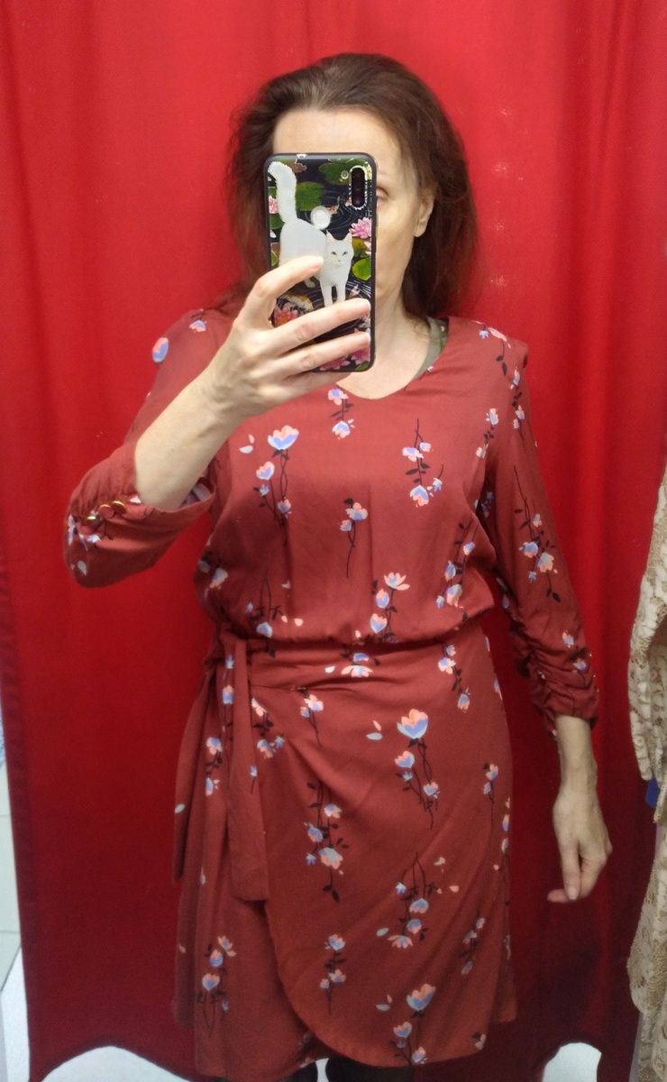 Здравствуйте, у меня чрезвычайно вредный характер, мне много чего не нравится, в частности морковка. Поехали на той неделе в Ашан, там бывают самые дешёвые финики, а мы их вместо печенья и конфет употребляем)), я с чаем их уплетаю. Решила набрать морковки, но почему то на каждую штучку налеплена пригоршня каменной земли. И всё это называется "🥕". Надо писать честно название товара и даже можно патриотично придумать, например " родная землица с корнеплодом". Совсем другое дело! Довольные граждане знают за что выкладывают денежки)). И никто не будет стоять её обковыривать ибо идёт это всё набором. Продолжу обзор из секонда, цена минимальная 590 за кг и ещё скидка 20%. Платье с цветами, несмотря на фото, оно все-таки без настоящего запаха. Представьте передник, который одной стороной вшит в шов, а другая сторона с завязкой. Если развязать завязку, то передник будет болтаться сбоку. Не знаю зачем такая конструкция, но распахиваться не будет. Новое платье с запасной пуговицей. Вискоза. Б