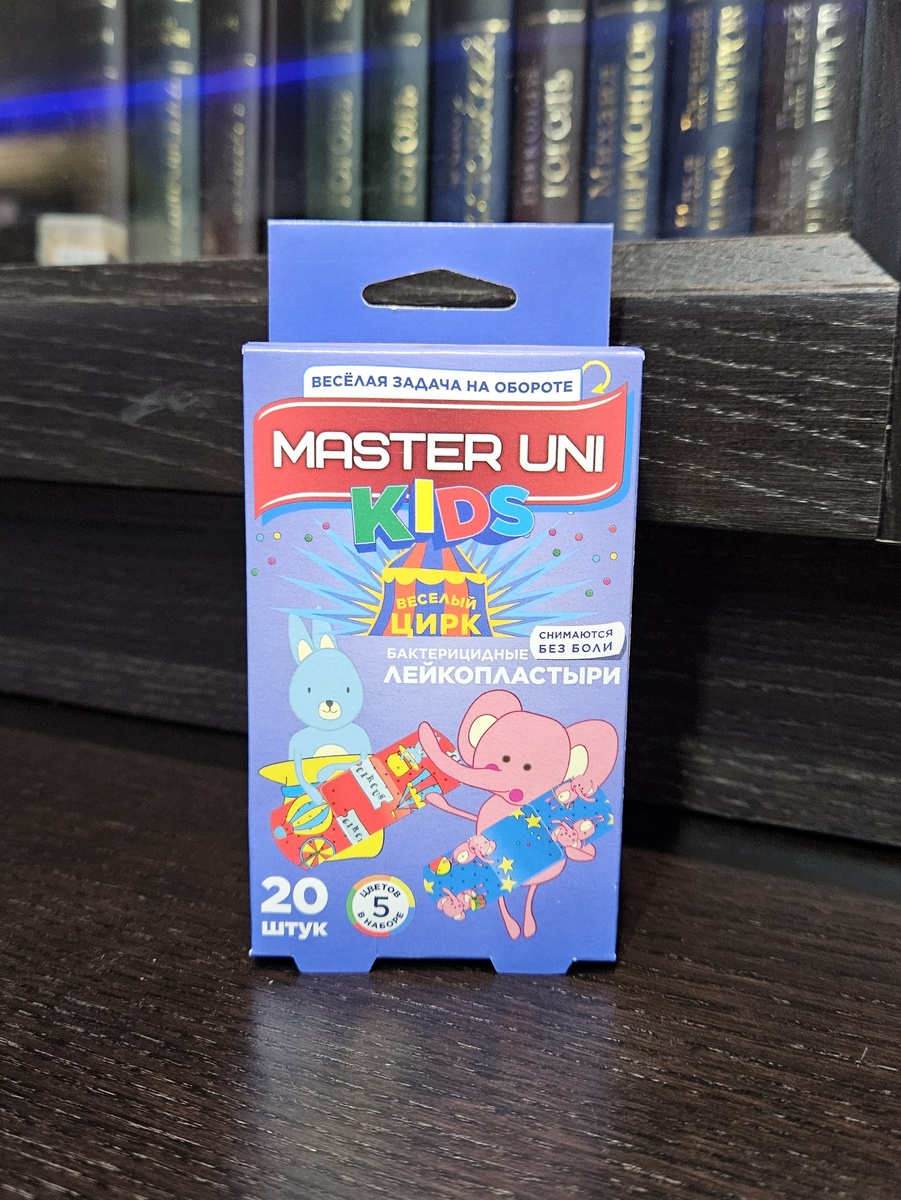 Лейкопластырь Master Uni kids Детки все шебутные и на улицу приходится носить боекомплект в сумке. Обычно это банеоцин, перекись и лейкопластырь. Чтобы ребенку было веселей и интересней, а главное, чтобы его отвлечь от страданий, придумали цветной лейкопластырь. Яркая коробочка синего цвета с детскими рисунками выделяется на полочке среди простого лейкопластыря. На обороте есть развлечение для ребенка постарше. Нужно найти отличия между картинками. Пока мама заклеивает коленки, ребенок будет занят. Срок годности: 5 лет Количество: 20 шт Каждый лейкопластырь в индивидуальной упаковке. Легко открывается , справится каждый ребенок. Размер одного лейкопластыря 56*19 мм, практический как взрослый. В наборе пять расцветок. Яркие и с рисунками, точно понравятся ребенку. Мы еще все не использовали, благо редко нужен, но красный совпал. Скорее всего остальные рисунки такие как и на картинке. Основа у лейкопластыря не тканевая, а полимерная. Но держится хорошо и не скатывается я