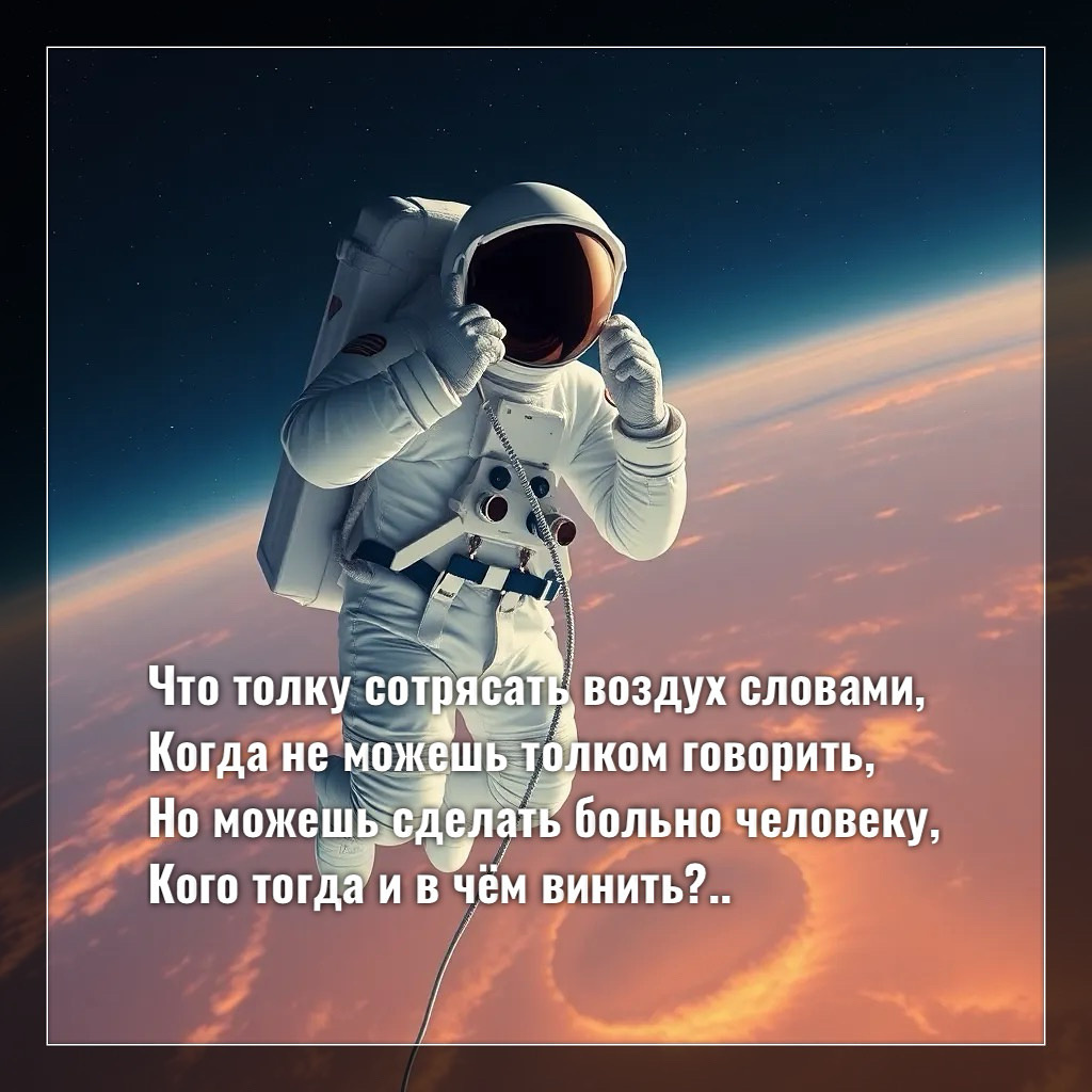 Что толку сотрясать воздух словами, Когда не можешь толком говорить, Но можешь сделать больно человеку, Кого тогда и в чём винить? Сам человек не часто замечает, Как ловко оставляет тёмный след На каждом светлом, Божьем сердце, И вот события уже сошли на нет, И вот здоровье начинает сыпаться, А стрелки на часах журчат - пора, Как люди зла внутри не замечают? Но наступает новая пора И ты уже забыл про козни, Про ненависть, что сыпалась в ответ На каждый шаг, движение и действие, И снова тушат яркий свет, А ты сопротивляться не пытаешься, Ты просто тонешь, всех вокруг любя, Как жаль, что очень часто в жизни, Здесь люди забывают про себя, И забывают про Души своей палитру, Всё Небу делают наперекор. Всевышний знает, как Душе напомнить, Как сделать так, чтоб не было здесь ссор, Но только Небо не со всеми говорит, Бывает молча темноту отодвигает, И всех, кто в жизни забывал про главное, Оно через «удары» к Богу возвращает, Как странно, что опять молчит «Небесный, всем доступный телефон», В