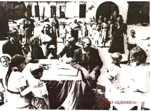 Согласно архивному документу от ГКУВО «ЦДНИВО», стол для процедуры установили прямо на улице. За ним сидят люди в костюмах, а рядом выстроилась очередь из мам с ребятишками. На заднем плане видно разрушенное здание.