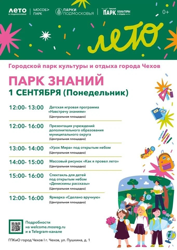 ✨ Фестиваль в Городском парке 🎩 ПАРК ЗНАНИЙ ЦЕНТРАЛЬНАЯ ПЛОЩАДКА 👉12:00 - 13:00 Игровая программа 👉13:00 - 14:00 "Урок Мира" 👉14:00 - 15:00 Массовый рисунок "Как я провел лето" 👉15:00 - 16:00 Спектакль для детей под открытым небом "Денискины рассказы" 🚫 Возраст: 0+ 📆 01.09.2025 🕛 12:00 🏢 Городской парк культуры и отдыха 📍 г. Чехов, ул. Пушкина, д.1 🪙 Вход свободный❗️ ⭐Поддержать канал голосом ✅ Мероприятия Чехов https://dzen.ru/id/66cc4b48e9ef144699238a51 http://vk.com/chekhov_events http://dzen.ru/chekhov_events