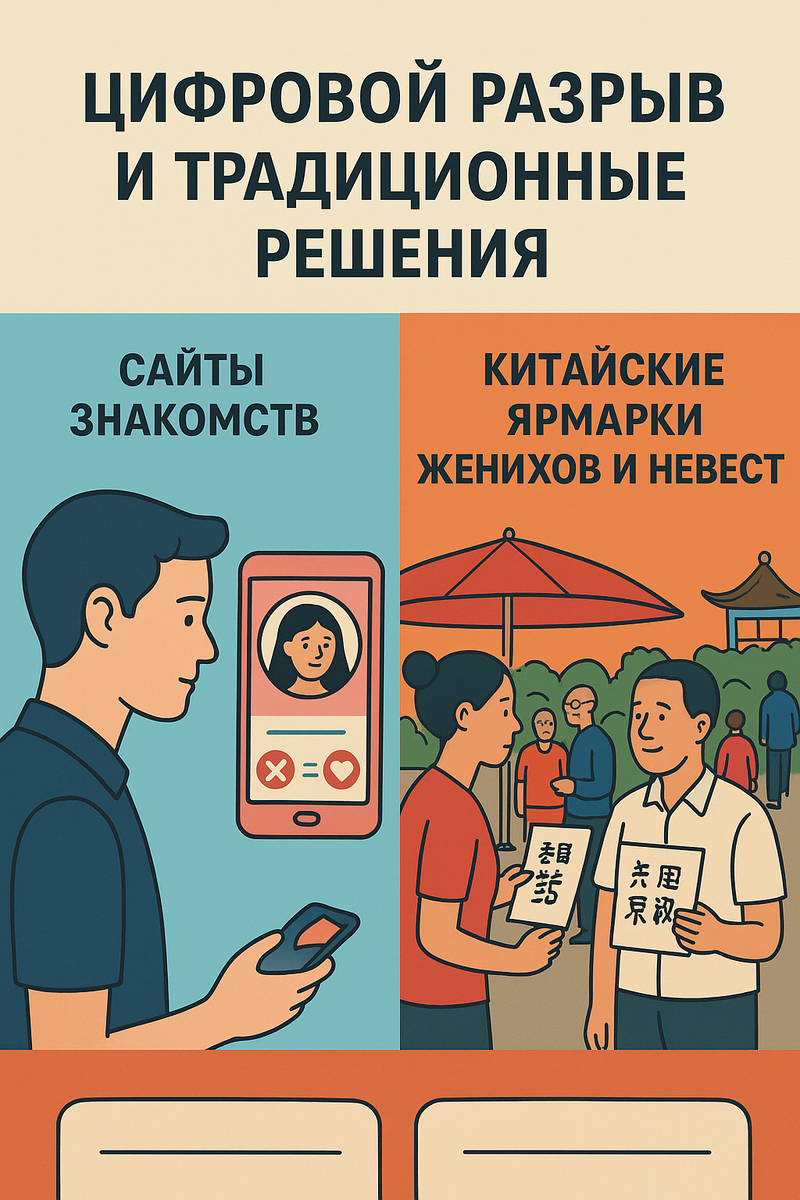 - Почему Китай отказался от цифровых знакомств? Из-за политики «одна семья — один ребёнок» в Китае возник гендерный дисбаланс: на 100 женщин приходится 118 мужчин. Онлайн-платформы не смогли решить проблему, и государство поддержало традиционные «ярмарки женихов и невест». В 2024-2025 годах число браков упало до 6,1 млн (минус 20,5%), но рынки помогают стабилизировать ситуацию.