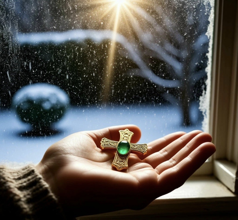 Я взяла шкатулку дрожащими руками. Крошечный крестик лежал на потёртом бархате, словно только что сошёл со старинного портрета. Золото было тёплым, будто его только что сняли с человеческого тела. А тот самый камешек в центре — тёмно-зелёный, почти чёрный, — мерцал глубинным, живым светом, словно в нём была заключена капля ночного неба.