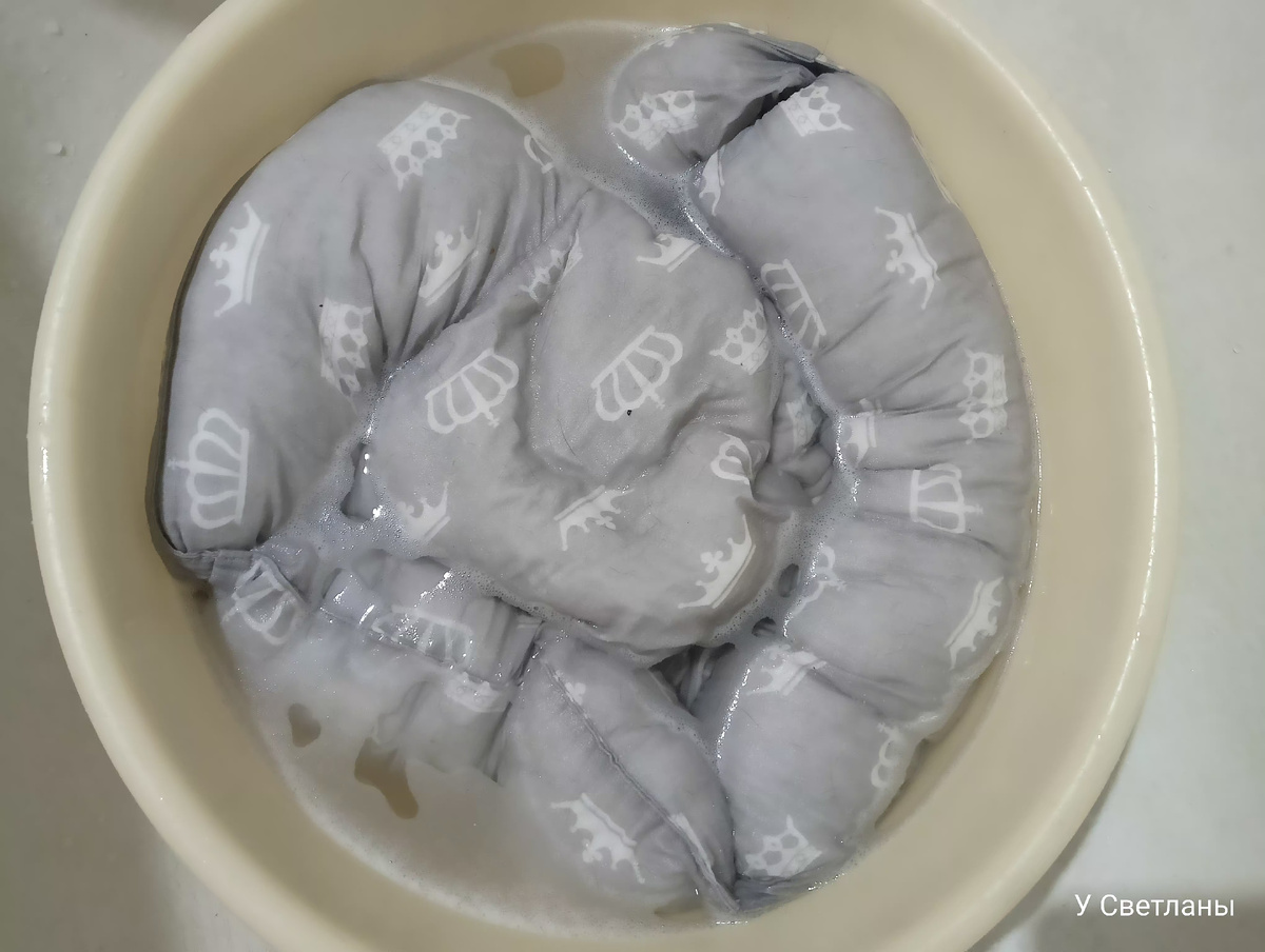 Бельчик всю ночь спал в Васькиной кроватке и, конечно же, она испачкалась, он же у нас тот ещё "чистюля". Мне пришлось её замочить на несколько минут в тазике.