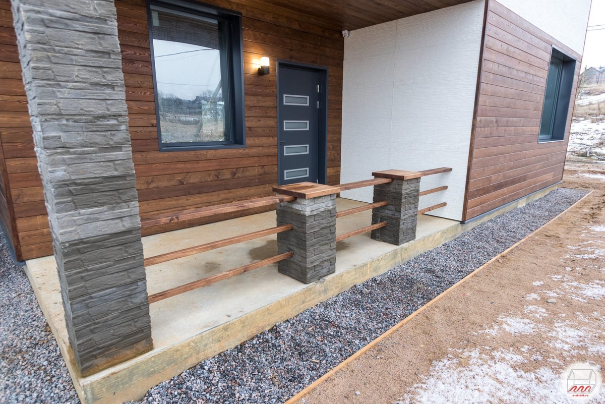 В своей недавней подборке вариантов отделки цоколя и устройства отмостки я показывал несколько разных примеров, но все фотографии были сделаны почти что сразу после сдачи дома. Вот, к примеру, дом в Ропше: