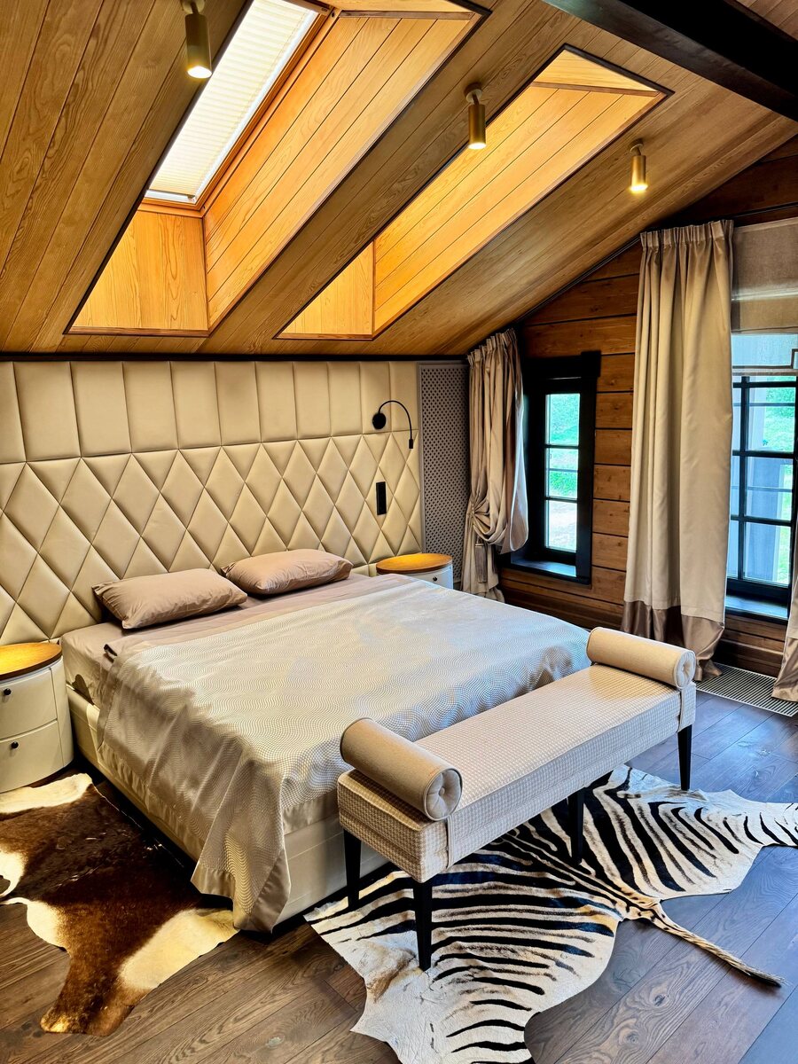 В большом гостевом доме «Валдайской усадьбы» (сдаётся целиком) обустроено 7 спален на двух этажах, где с комфортом могут разместиться до 14 человек. В каждой спальне есть всё необходимое для удобного и длительного проживания: отдельная ванная комната, туалет и гардероб. Интерьеры каждой категории спальных комнат выполнены в охотничьем антураже. Они разработаны по оригинальным авторским дизайн-проектам и обладают уникальными концептуальными решениями. Моя спальня на втором этаже — самая-самая — «Сафари Делюкс» (30 м2). Здесь роскошная двуспальная кровать, гостиная зона с диваном, просторный санузел с ванной и душевой, отдельная гардеробная, сейф, кондиционер, большой телевизор со Smart-TV и обширной коллекцией фильмов и сериалов, балкон с лёгкой мебелью - Валдайская усадьба, Новгородская область #МояРоссия