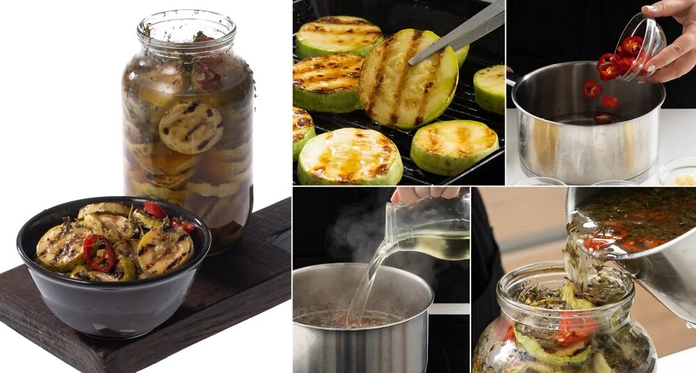 С молоденькими кабачками не нужно особых ухищрений — их можно потушить со сметаной, поджарить, превратить в икру и, наконец, съесть сырыми, добавив в салат. Ну, или замариновать — приведенный ниже рецепт тут тоже подходит. Куда сложнее приспособить кабачки, когда их первая молодость уже позади, кожура становится каменной, а семена — ощутимыми. К началу осени такие кабачки-переростки вытесняют с грядок молодую поросль. Можно, конечно, их фаршировать, но это не решение проблемы. Да и возиться не хочется, а бросить — жалко. Поэтому вот вам рецепт, как поступать с такими возрастными кабачками. Главный секрет — обжарить их на гриле, чтобы сделать мякоть действительно мягкой, а затем окунуть в душистый маринад, который вернет порядком заматеревшей кабачковой плоти былую бодрость и снабдит тонким ароматом тимьяна, майорана и мяты. Кабачки 1 кг Оливковое масло 5 столовых ложек Вода 400 мл Соль 5 г Сахар 30 г Лимонный сок 90 мл Чеснок 1 головка Тимьян 5 веточек Перец чили 1 штука Сушеная мята