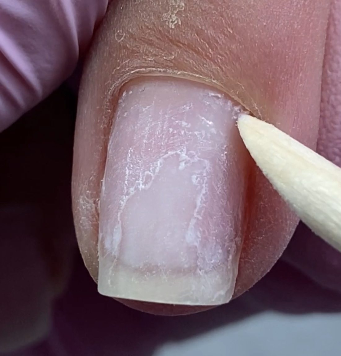 Снятие гель-лака ниткой стало популярно после того, как несколько роликов завирусилось в соц.сетях. Поскольку метод досточно простой и доступный - многие начали пробовать этот способ на себе. На первый взгляд нитка не вредит ногтевой пластине, но это не совсем так. Нитка продевается между ногтем и покрытием и затем понемногу тянется вниз к свободному краю, пока покрытие полностью не отделится от ногтя. Если мастер соблюдает технологию нанесения гель-лака и верно подготавливает ногтевую пластину, то гель-лак не так-то просто снять таким способом - нить просто невозможно продеть между покрытием и ногтем, поскольку отсутствуют отслойки и отросшие затеки, за которые можно зацепиться, но даже если такие есть - гель-лаковое покрытие в других участках ногтя может очень крепко держаться. Таким образом, снимая покрытие ниткой - сдирается и дорсальный слой ногтя, а иногда и не только дорсальный - очень легко можно сорвать часть ногтевой пластины, что может обернуться плачевными по