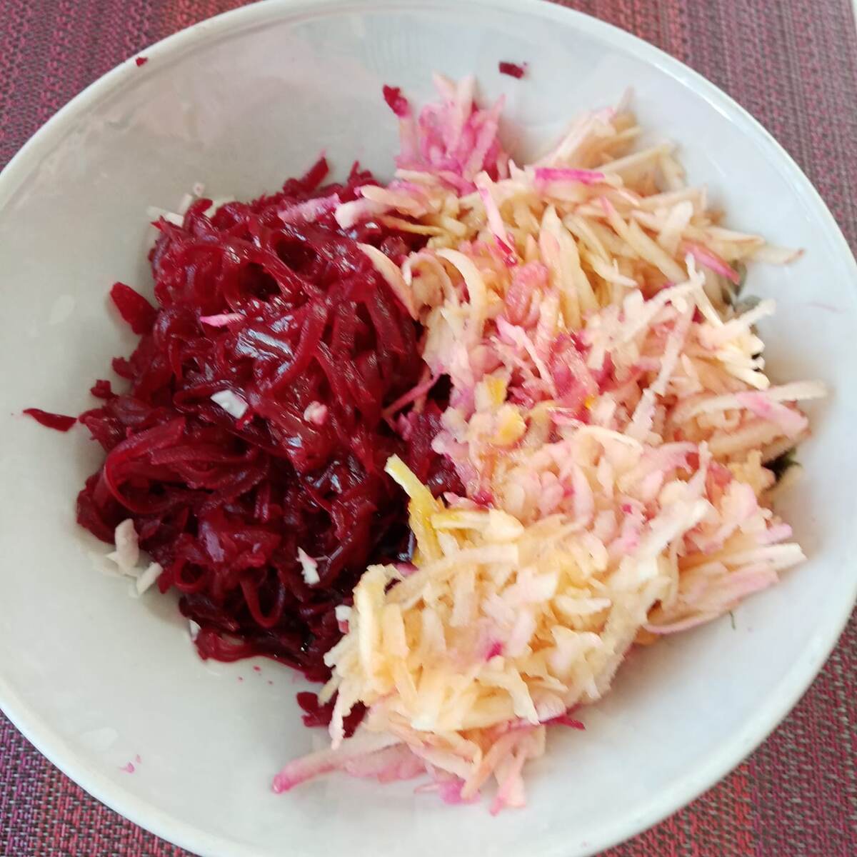 Салат из свеклы и яблок – настоящее воплощение свежести и витаминов на вашей тарелке. Этот салат не только радует глаз своим ярким цветом, но и удивляет гармоничным сочетанием сладких и землистых ноток, дополненных пикантным ароматом чеснока. А главное – готовится он буквально за считанные минуты! Что нам понадобится (Ингредиенты): Я добавляю яблоки примерно в одинаковых пропорциях, для здоровья и очищения организма полезнее. Но, думаю можно уменьшить количество яблок, кому как нравится. Как приготовить: Подготовка свеклы: Свеклу тщательно вымойте, отварите, очистите от кожуры и натрите на крупной терке. Если вы предпочитаете более нежную текстуру, можно использовать терку для корейской моркови. Подготовка яблок: Яблоки вымойте, удалите сердцевину и также натрите на крупной терке. Чтобы яблоки не потемнели, можно сбрызнуть их небольшим количеством лимонного сока сразу после натирания. Добавляем чеснок: Пропустите чеснок через чеснокодавилку прямо в миску с натертыми свеклой и яблока
