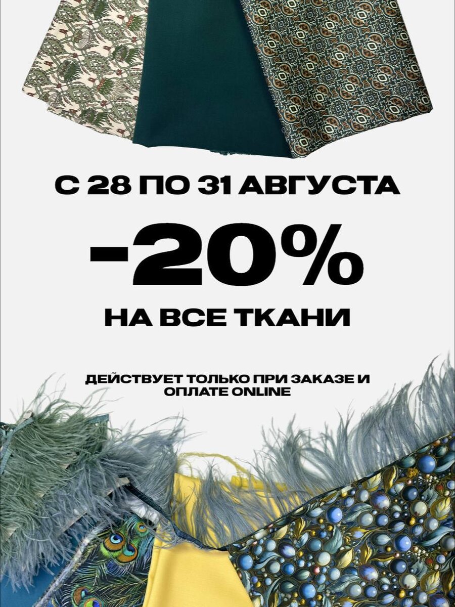 Последний день акции! ✨- 20% НА ВСЕ ТКАНИ! ➡️НА САЙТ⬅️ Условия акции: ◦ Скидка действует с 28 по 31 августа на все ткани ◦ Скидка действует при заказе и оплате online и в розничных магазинах ◦ Не суммируется с дисконтной картой ◦ Не суммируется с другими акциями и скидками