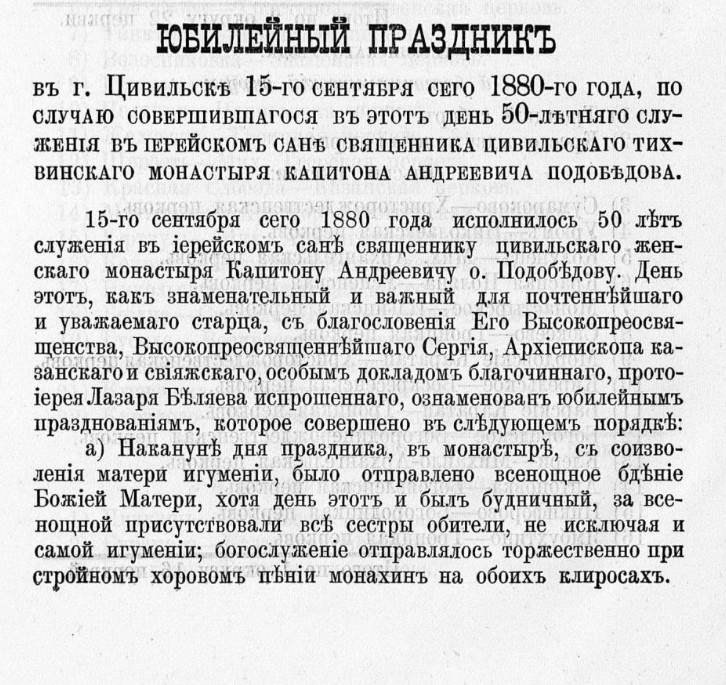 15-го сентября сего 1880 года исполнилось 50 лет служения в иерейском сане священнику Цивильского женского монастыря Капитону Андреевичу отцу Подобедову. День этот, как знаменательный и важный для почтеннейшего и уважаемого старца, с благословения Его Высокопреосвященства, Высокопреосвященнейшего Сергия, Архиепископа Казанского и Свияжского, особым докладом благочинного, протоиерея Лазаря Беляева испрошенного, ознаменован юбилейным празднованием, которое совершено в следующем порядке:
