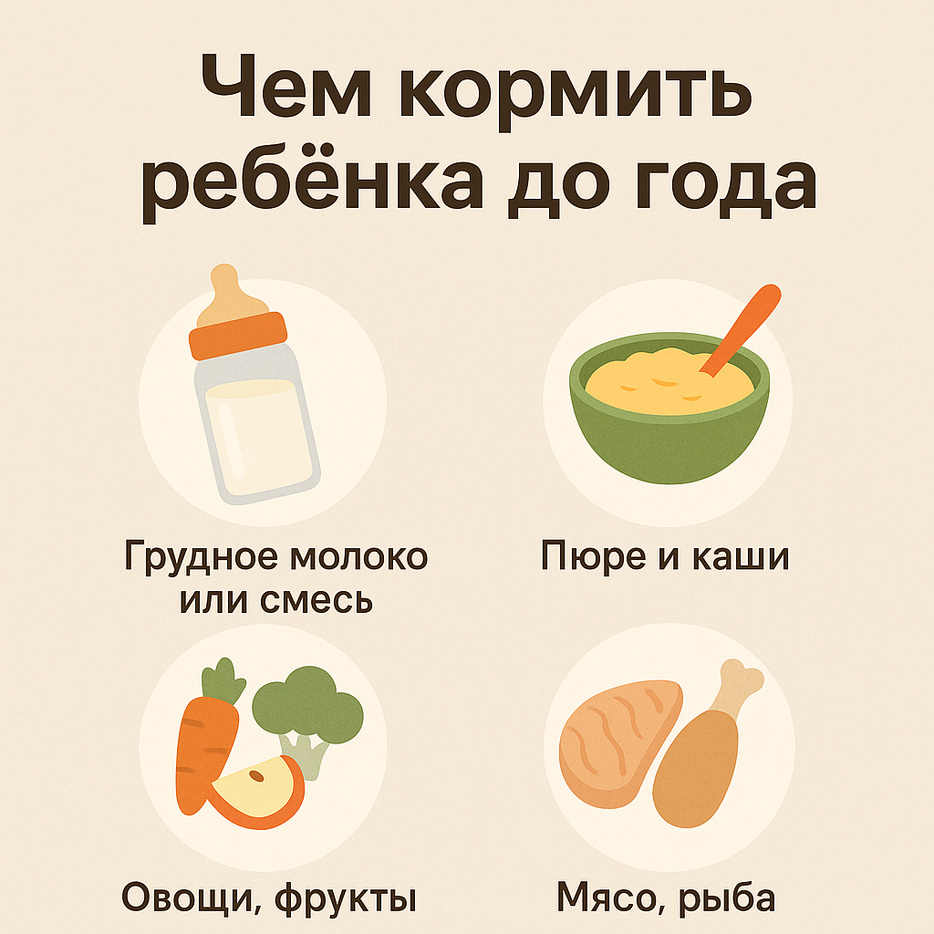 Чем кормить ребёнка до года: пошаговое руководство для родителей 👶 Как правильно кормить малыша, когда вводить прикорм, с чего начинать и можно ли давать взрослую еду? Первый год жизни — решающий этап для здоровья ребёнка. От питания зависит развитие мозга, иммунитета, костей и мышц. Давайте разберёмся, как правильно организовать питание малыша и не допустить ошибок. До полугода основная пища — грудное молоко или адаптированная смесь. Они полностью покрывают потребности малыша в питательных веществах и жидкости. Педиатры советуют начинать с 6 месяцев, но нужно учитывать готовность ребёнка. Сигналы: Начинайте с мягких, однокомпонентных пюре. ⚠️ Каждый новый продукт вводите постепенно: начинайте с чайной ложки и следите за реакцией. К году ребёнок может пробовать почти всё, но с оговорками: Совет: готовьте для малыша отдельно или откладывайте порцию до добавления соли и специй. 🎯 Вывод: прикорм — это путешествие в мир вкусов. Начинайте постепенно, уважайте темп ребёнка, и к году он