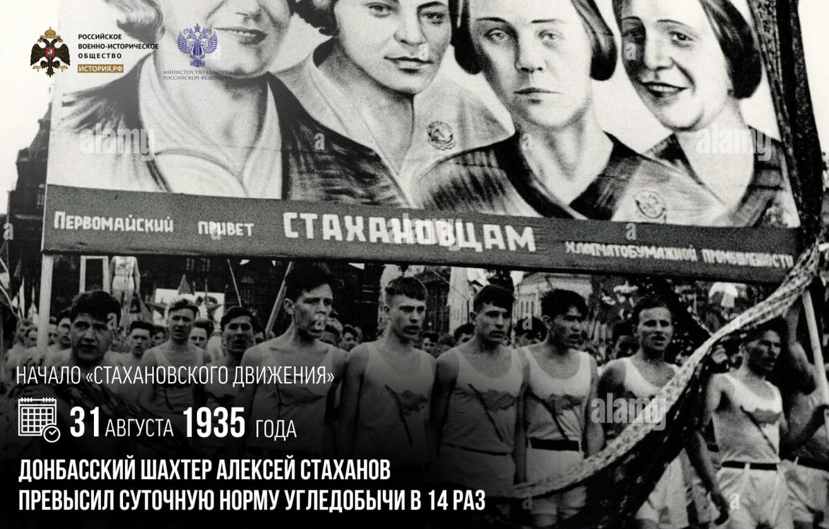 Начало «стахановского движения». 31 августа 1935 года донбасский шахтер Алексей Стаханов превысил суточную норму угледобычи в 14 раз