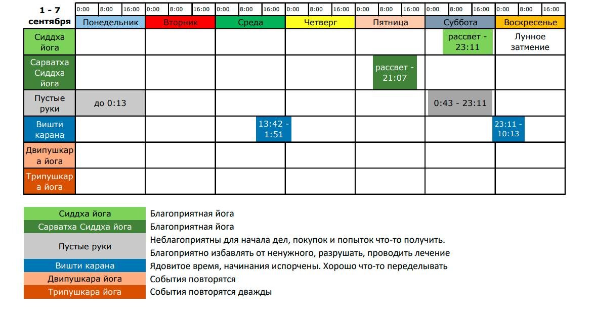 Неделя 1 - 7 сентября Часовой пояс GMT +3 (MSK) Главное событие недели - лунное затмение в воскресенье вечером. Затмение пройдёт в знаке Водолея, и его будет хорошо видно на территории всей Евразии (только смотреть на него не надо). Поэтому придётся принять некоторые меры предосторожности, о которых напишу в следующем посте. Начиная с пятницы старт важных дел лучше отложить. И после затмения выждать хотя бы пару дней. 🔸Переходов планет не будет, а Сатурн по прежнему ретроградный. Закрываем долги по работе. 🔹Понедельник - день напряжённый. В этот раз такой 🔹Вторник - воинственный день. Если используете силу во благо, много добьётесь 🔹Среда - пост Экадаши. Первая половина дня принесёт воодушевление и целеустремлённость. После 13:42 добавится ядов в виде агрессии 🔹Четверг - хооший день со стабильной энергетикой. Только не начинайте поездку 🔹Пятница - хороший день. Слушайте других, потом слушайте себя внимательно. Не забудьте отдохнуть и насладиться чем-нибудь. И будет вам счасть