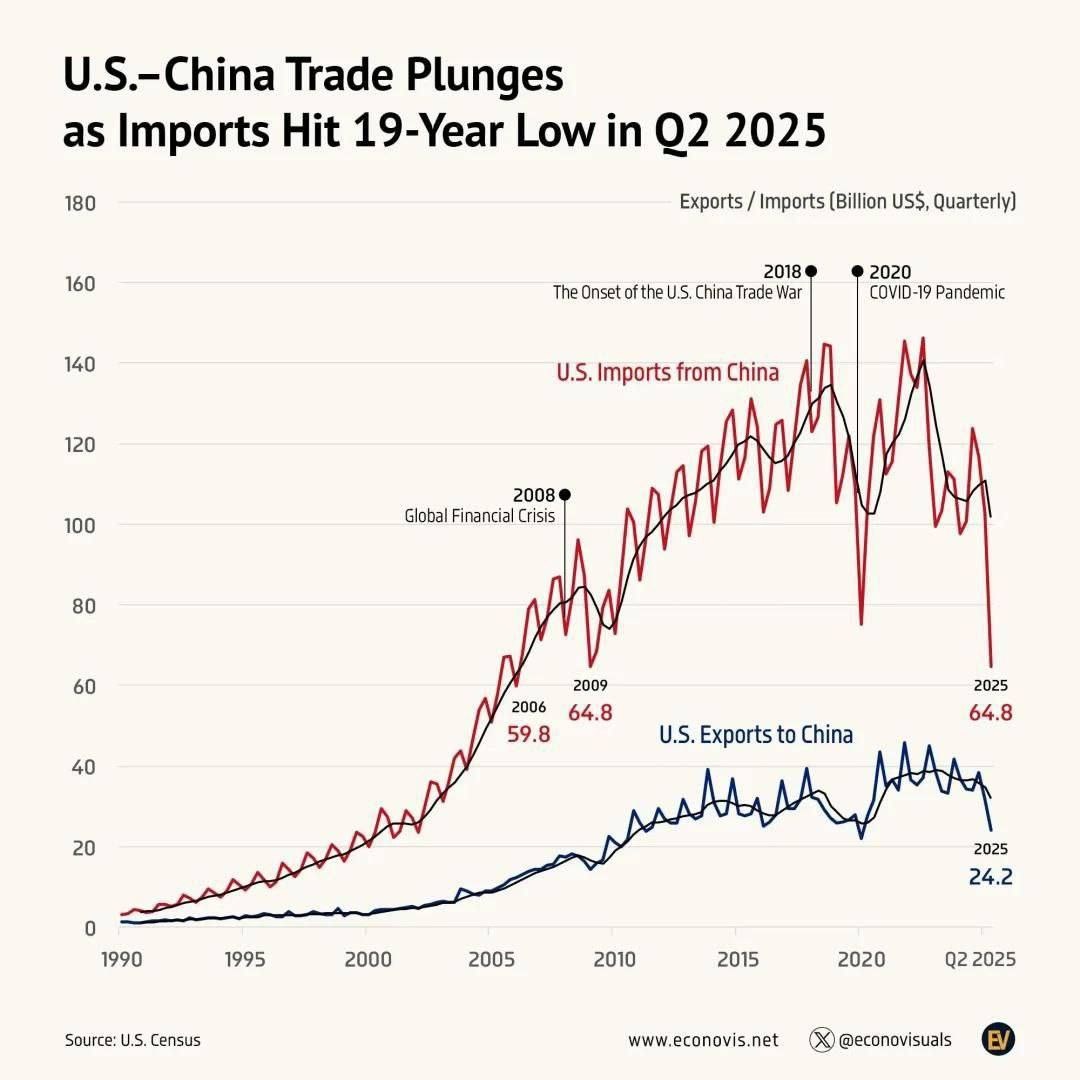 Торговля между США и Китаем достигла 19-летнего минимума Во втором квартале 2025 года импорт из Китая в США упал до 64,8 млрд долларов, что является самым низким квартальным уровнем с первого квартала 2006 года. Импорт сократился на 36% в годовом исчислении, экспорт упал на 29%, а общий объем торговли сократился на 34%. Торговый дефицит США с Китаем сократился на 39% за один год. Если так пойдёт и дальше, объем товарооборота Китая с Россией уже в 2026 году будет выше чем с США. US-China-Handel erreicht 19-Jahrestief Im zweiten Quartal 2025 sanken die US-Importe aus China auf 64,8 Milliarden US-Dollar – den niedrigsten Quartalsstand seit dem ersten Quartal 2006. Die Importe gingen im Vergleich zum Vorjahr um 36 % zurück, die Exporte um 29 %, und der Gesamthandel sank um 34 %. Das US-Handelsdefizit mit China hat sich innerhalb eines Jahres um 39 % verringert. Wenn es so weitergeht, wird Chinas Handel mit Russland bis 2026 höher sein als sein Handel mit den USA.