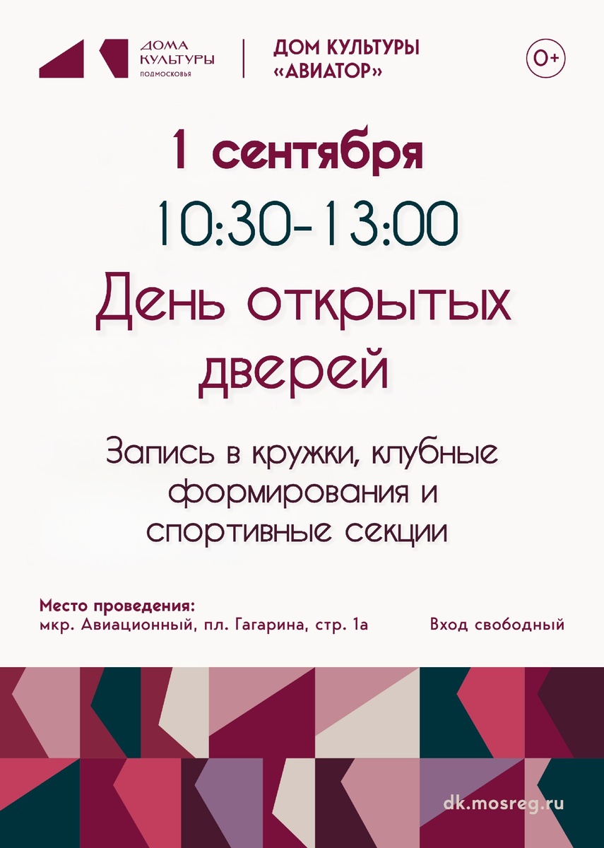 ✨ День открытых дверей 🚫 Возраст: 0+ 📆 01.09.2025 🏢 Городской дом культуры «Авиатор» 📍 г. Домодедово, ул.Гагарина, д.1 💰 Вход свободный❗️ ✅ Мероприятия Домодедово https://dzen.ru/id/66f10385cc4c5a16f7b5fb02 http://vk.com/domodedovo_events http://dzen.ru/domodedovo_events