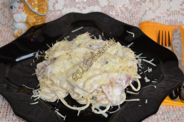 Паста «Карбонара» с беконом Ингредиенты: Макароны - 150 гр. (спагетти) Бекон сырокопченый нарезка - 200 гр. Чеснок - 3 зуб. Масло оливковое - 30 мл. Сливки - 250 мл. Соль - 3 гр. Перец черный молотый - 3 гр. Сыр пармезан - 50 гр. Источник: https://rusdinner.ru/page/pasta-karbonara-s-bekonom