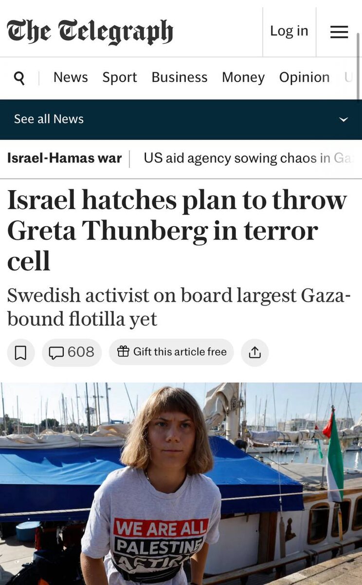 Israel is ‘drawing up plans’ to detain GRETA THUNBERG ‘in terrorist level’ conditions — The Telegraph Goal is to break ‘her appetite’ for such activism Adds ‘dozens of boats from across the Mediterranean’ will join her to try to break the Israeli blockade