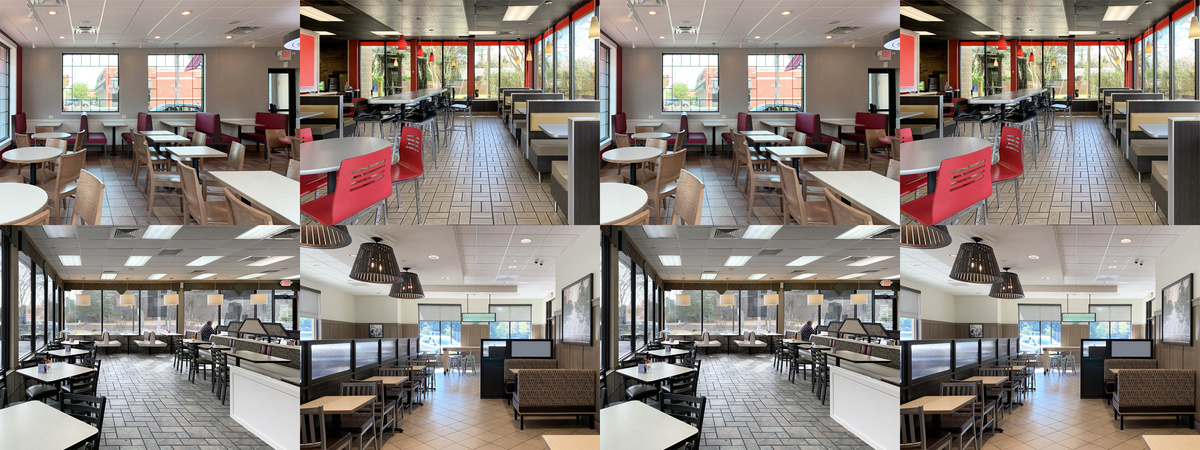 Если все сети портят свои интерьеры по всем трем категориям, они становятся одинаковыми. Ниже несколько сетевых заведений, из интерьеров которых я намеренно убрал брендинг — попробуйте угадать где тут «Макдоналдс», KFC, «Бургер Кинг» и Chick-fil-A (правильные ответы — в конце статьи). Не нужно быть экспертом в архитектуре, чтобы понять что все это плюс-минус одно и то же.