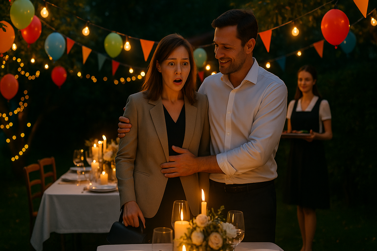 Участок не узнать. Повсюду висели разноцветные шары и гирлянды. Между деревьями протянуты праздничные флажки. А в центре лужайки стоял накрытый стол — с белой скатертью, красивой посудой, свечами.