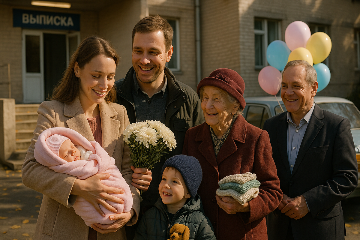 Рядом с машиной стояли Пётр Андреевич и Клавдия Степановна. Старушка надела лучшее пальто и праздничную шляпку, принесла подарки для малышки — вязаные пинетки, кофточки, мягкие игрушки.