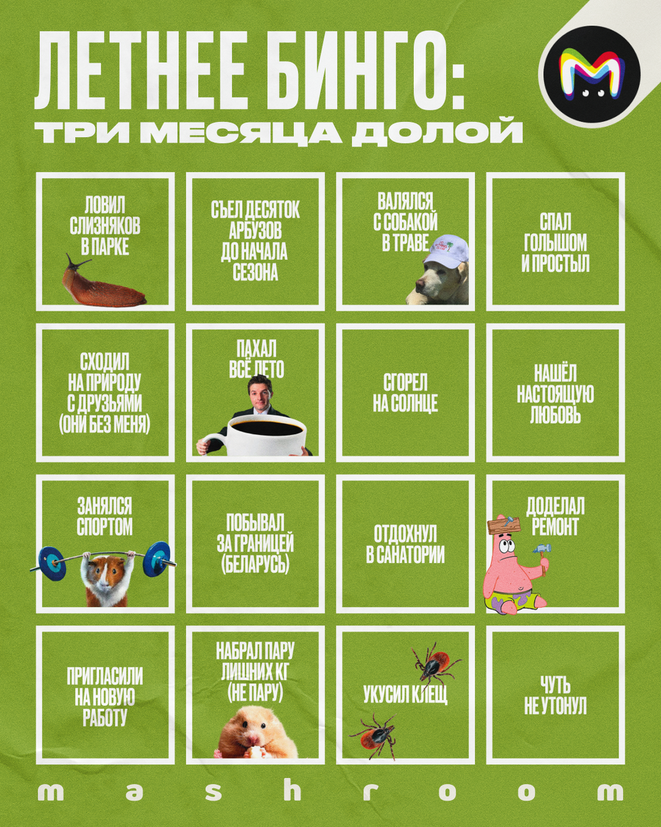 Для тех, кто вдруг забыл: завтра начинается осень. Увы, лето подошло к концу. Надеемся, что школьники и студенты отдохнули, а взрослые успели побывать в отпуске. В этом бинго мы собрали разные события, которые могли с вами приключиться в течение последних трёх месяцев. Проставляйте галочку или крестик в том месте, где вариант совпал, и отправляйте в комментарии. Если подходящего не нашлось, присылайте письменный ответ.