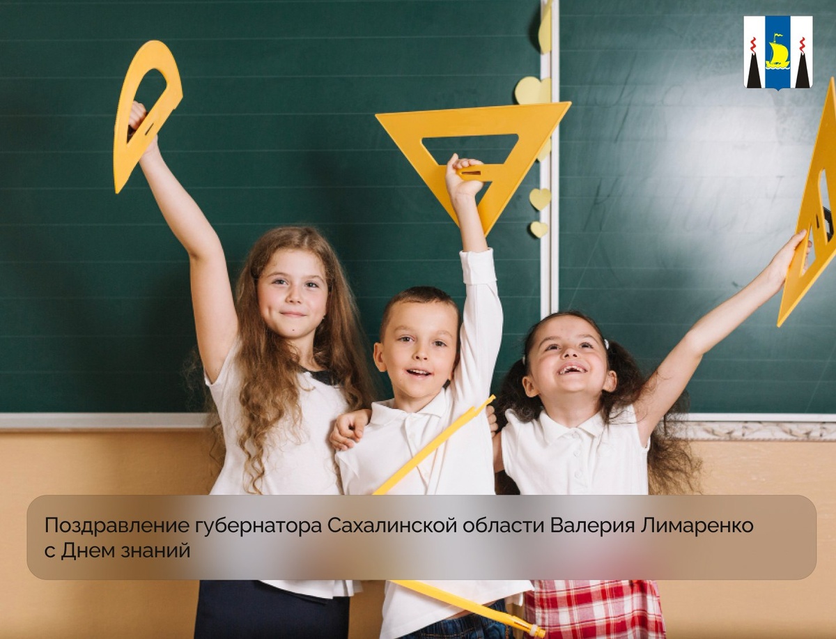 Уважаемые сахалинцы и курильчане! Поздравляю вас с Днем знаний и началом нового учебного года! Школьная пора, студенчество – очень ответственный период. В это время закладывается фундамент будущих достижений отдельного человека и поколения в целом, формируется будущее всей страны. Поэтому мы с особой ответственностью подходим к развитию образования, стремимся создавать лучшие условия для юных жителей региона. Сегодня первых учеников принимают две новые школы в Южно-Сахалинске. Одна – самая большая в области – построена в жилом комплексе «Авангард». Другая – в южной части города. Мы поддерживаем стремление наших ребят познавать мир, развиваться, получать нужные области профессии. Создаем «Кванториумы» и «Точки роста». Помогаем оплачивать учебу в островных вузах. Строим кампус мирового уровня СахалинТех. В День знаний желаю школьникам и студентам ставить перед собой самые амбициозные цели и достигать их. Учитесь, исследуйте, задавайте вопросы и не бойтесь мечтать! Благодарю учителей