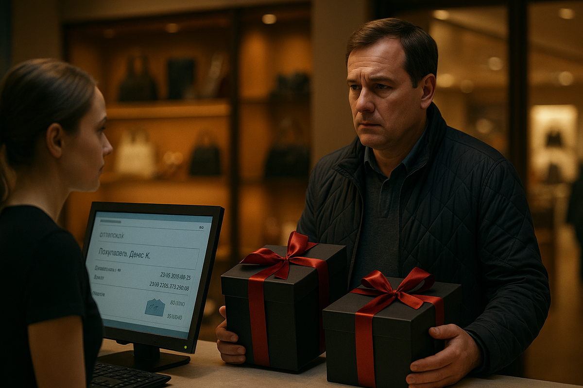 — У нас подарочные наборы с такими кодами. Покупка была вчера. Касса №2. — Девушка повернула экран ко мне на секундах, будто случайно. Я успел прочитать: «Сумма: 31 900. Товар: ремень мужской, кошелёк женский. Покупатель: Клиент по карте». Ни фамилии, ни имён. Только: «Телефон +7(9**) *--77» и четыре буквы в названии карты лояльности: «Den…»