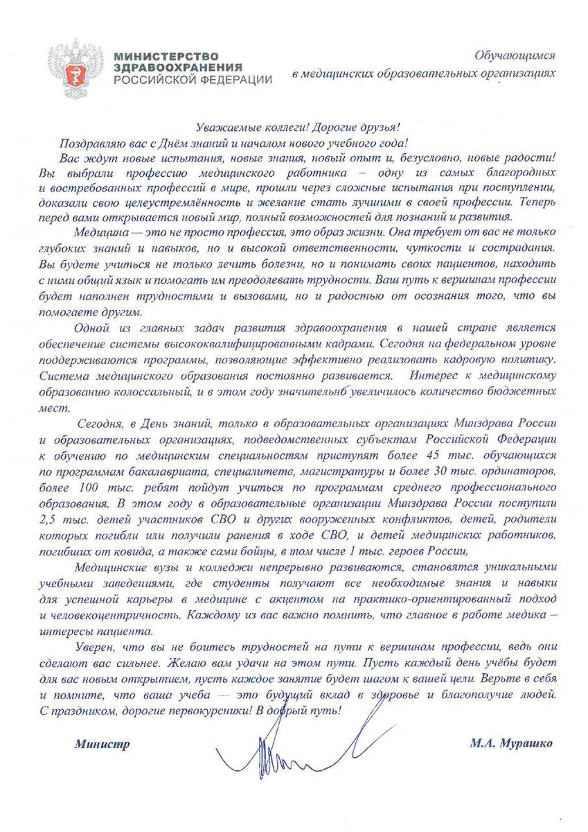 Поздравление с Днём знаний от министра здравоохранения РФ Михаила Альбертовича Мурашко🇷🇺