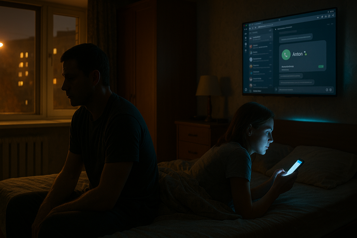 Иногда ночь делит человека на «до» и «после» не громом и не хлопком двери, а тонкой синей полосой света, которая тянется по обоям от экрана телефона. В ту ночь полоска легла на нашу стену — и я впервые за долгое время почувствовал, что в этой комнате нас двое, но вместе мы не лежим. Я слышал, как Оля шепчет экрану — коротко, сдержанно, будто боится разбудить не меня, а свою совесть. Я закрыл глаза, но сна не было. Я просто считал секунды между её вдохами и вибрациями оповещений.