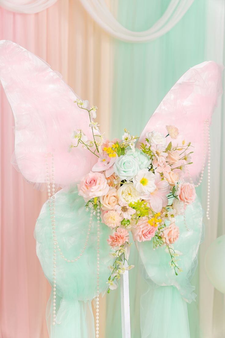 Тренд "бабочки из ткани" - это использование декоративных элементов в виде бабочек, выполненных из ткани и подвешенных на нитях или лентах. Эти элементы могут быть использованы в качестве декораций для фотозон, создавая уютную и романтическую атмосферу.