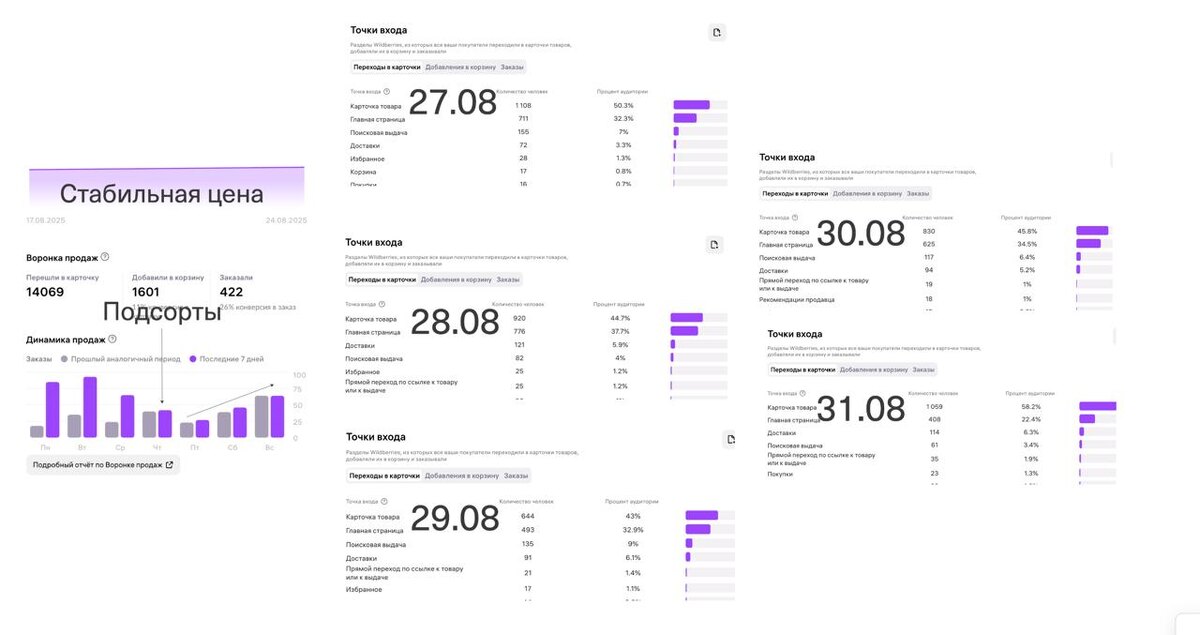 😂Хьюстон мы падаем... продолжение поста. 📌 26.08 у нас закончились основные размеры. Карточка сразу начала проседать вместе с падением % карточки и % главной. При этом: карточка не участвует в акции; СПП не самый топ 🧐 👉 Вовремя сделанный подсорт возвращает карточку на нужные позиции и восстанавливает заказы 👍 Как вы думаете, почему карточки резко падают в выдаче, как только вылетают ходовые размеры?😬 Интересно узнать ваши мнение в комментариях 👇 Отвечу завтра!