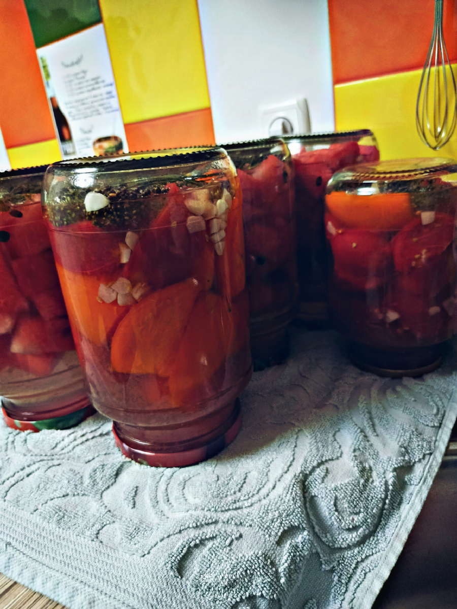 Мы закрывали 2-х литровые банки, поэтому все ингредиенты рассчитаны на данный объём: