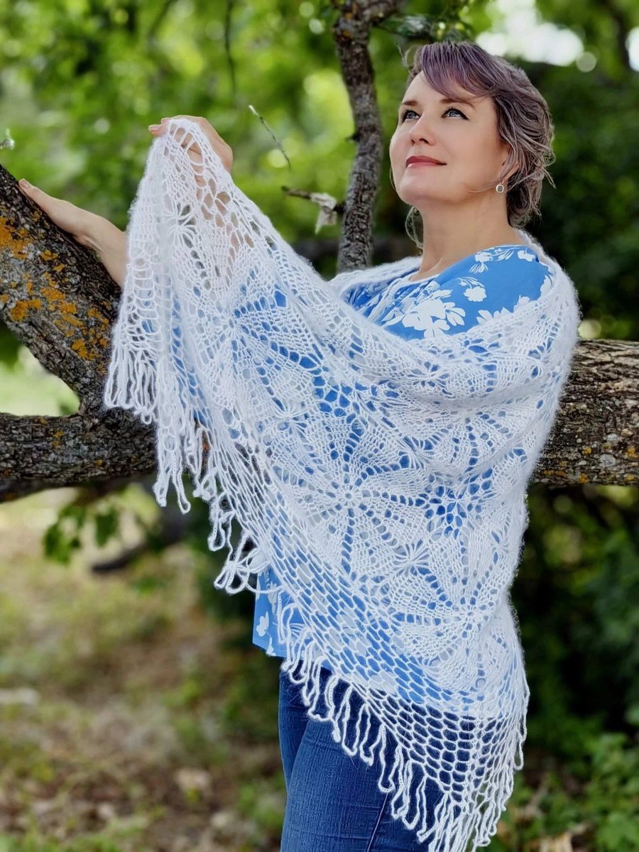 Пуховая шаль " Грезы " - это женственность, уют и роскошь .Ажурная , пуховая , нарядная с красивым , воздушным , цветочным узором , достойного размера и удобной треугольной формы - это изделие будет отлично смотреться не только в качестве крестильной, венчальной , пасхальной и религиозной одежды, но и как повседневная нарядная накидка. Легкая , но теплая и приятная на ощупь ажурная шаль согреет холодными днями и украсит любой Ваш образ, окружая нежным облаком и прекрасно сочетаясь с любым стилем