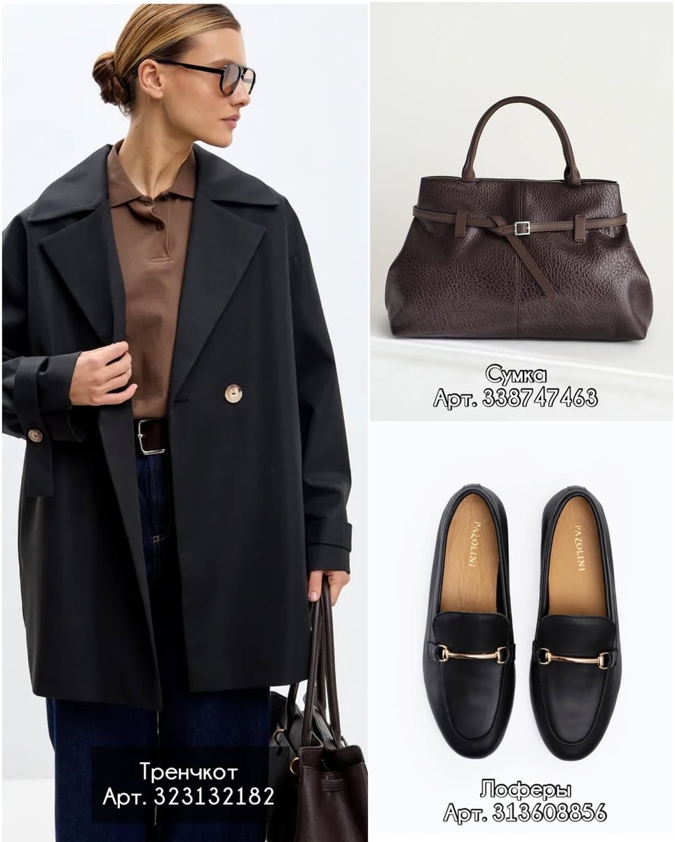 Осень — идеальный сезон, чтобы носить платья каждый день. Секрет тёплого и собранного образа прост: правильный тренч + выверенные аксессуары. Я собрала три готовых комплекта с Wildberries и расписала, какие именно платья к ним подобрать, чтобы выйти «как с картинки». Идём строго по фото и артикулам. Тренчкот — арт. 323132182 Сумка — арт. 338747463 Лоферы — арт. 313608856 Что видим на фото Какое платье сюда Стилистический совет С чёрным верхом и лоферами легко «урезать» рост. Ставьте колготки 20–40 den в тон обуви, добавляйте тонкий ремень поверх платья, чтобы обозначить талию. Украшения — минималистичные серьги-каффы или короткая цепь-якорь. Тренчкот — арт. 71463188 Сумка — арт. 267764823 Ботильоны — арт. 486834577 Что видим на фото Какое платье сюда Стилистический совет Держите пропорции: пояс тренча завязываем на 2–3 см выше естественной талии (узел «узкая петля»), чтобы визуально удлинить ноги. В зябкие дни под платье добавляйте термолонгслив телесного тона — он не даёт «полос