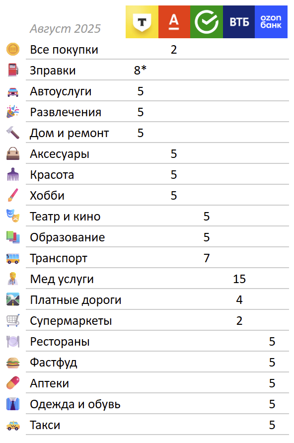 Сделал простую табличку: строки - категории трат, столбцы - банки, на пересечении - процент кешбэка. Позже добавил эмодзи для красоты и скорости поиска (когда банков стало пять).