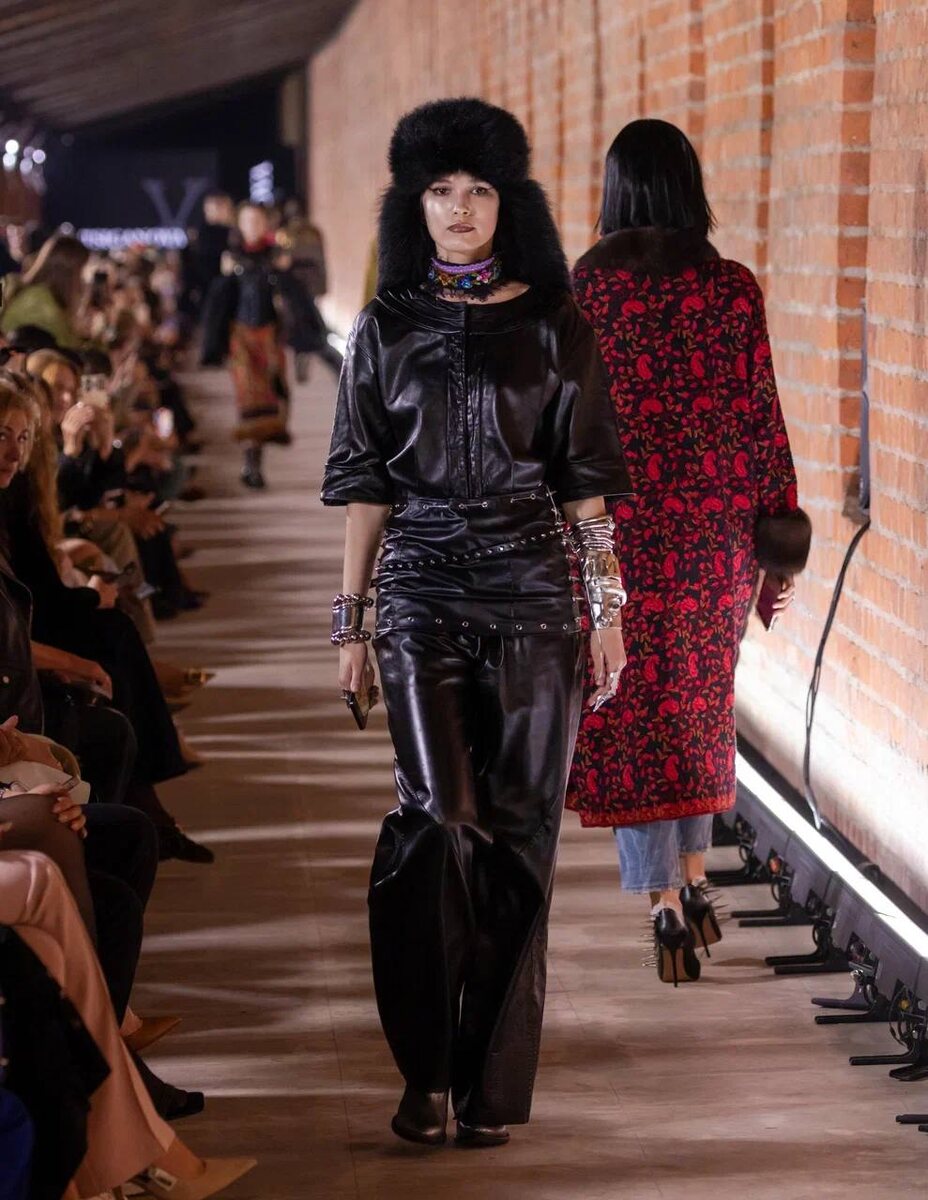 Коллекция бренда Tsiganova (Москва) на подиуме Московской недели моды В изделиях сплетаются готическая эстетика и скифские мотивы украшений с кутюрными элементами. Разнообразие фактур подчеркивается дерзкими аксессуарами и остромодными акцентами: черный бархат и сложные вышивки, металлический декор и натуральный мех. Коллекция балансирует на грани прошлого и будущего. Здесь можно уловить отголоски эпохи Романовых, эхо 90-х и 2000-х, и даже ностальгический «ретро-футуризм», который сегодня вновь становится частью мировой моды.