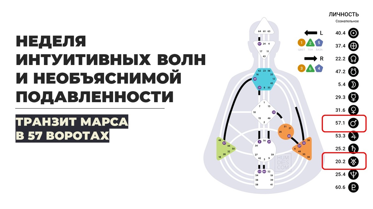 Привет, друзья! Сегодня мы о важных планетных транзитах с точки зрения Дизайна Человека. Транзиты – это не просто астрономические события, а настоящие "путеводители" по нашему внутреннему миру. На этой неделе (с 31 августа по 7 сентября 2025 года) Марс вошел в 57-е Ворота, и тем самым активировал канал 57-20 вместе с Ураном, который уже давно обосновался в 20-х Воротах (с 10 июля).