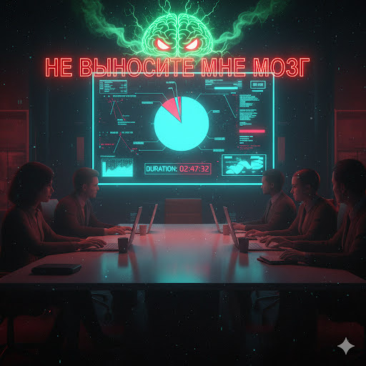 Наступил вторник, и я думал, что наконец-то займусь реальной работой. Но реальность жестока: в календаре появилось уведомление о совещании на два часа. Я вошел в комнату, и сразу понял, что это не рабочий процесс, а сеанс массовой пытки. Кто-то рассказывает о графиках, кто-то пытается шутить, а кто-то просто молча сидит, потому что его присутствие здесь абсолютно бессмысленно. Я смотрю на стрелки часов, которые будто замерли, и чувствую, как мозг начинает отключаться. Это не просто потеря времени — это принудительная медитация на чужую некомпетентность. Каждый слайд, каждая бессмысленная фраза, каждая попытка коллеги затянуть разговор — это как удар по вискам. Мозг кричит: «За что?! За что вы так со мной?!» Это чувство, когда ты находишься в комнате, полной людей, но при этом чувствуешь себя абсолютно одиноким в своей агонии. Это совещание нагло выносит мне мозг, превращая рабочий день в кошмар. Наивный! Совет: Как выжить на совещании-приговоре Не позволяйте бессмысленным совещаниям
