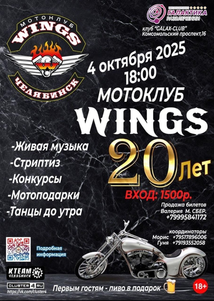 Дорогие друзья! 4 октября 2025 в 18:00 состоится празднование 20-летнего юбилея Мотоклуба «WINGS» в мегакомплексе «Галактика развлечений» по
