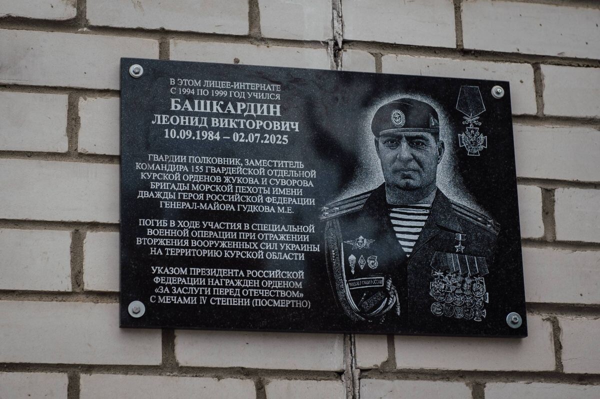В пригородном поселке имени Жукова состоялось торжественное открытие мемориальной доски в память о гвардии полковнике Леониде Башкардине, погибшем при отражении вторжения украинских диверсионно-разведывательных групп (ДРГ) в Курскую область. В церемонии открытия приняли участие представители областной администрации, а также родители офицера. Мемориальная доска установлена на здании лицея-интерната, где учился Леонид Башкардин. Леонид Башкардин занимал должность заместителя командира 155-й гвардейской отдельной Курской орденов Жукова и Суворова бригады морской пехоты имени дважды Героя РФ генерал-майора Гудкова М.Е. Он погиб 2 июля в приграничье Курской области вместе со своим командиром, Михаилом Гудковым, при отражении нападения ДРГ. Об этом сообщил врио губернатора Курской области Александр Хинштейн. За проявленные мужество и героизм Леонид Башкардин был награжден рядом государственных наград.