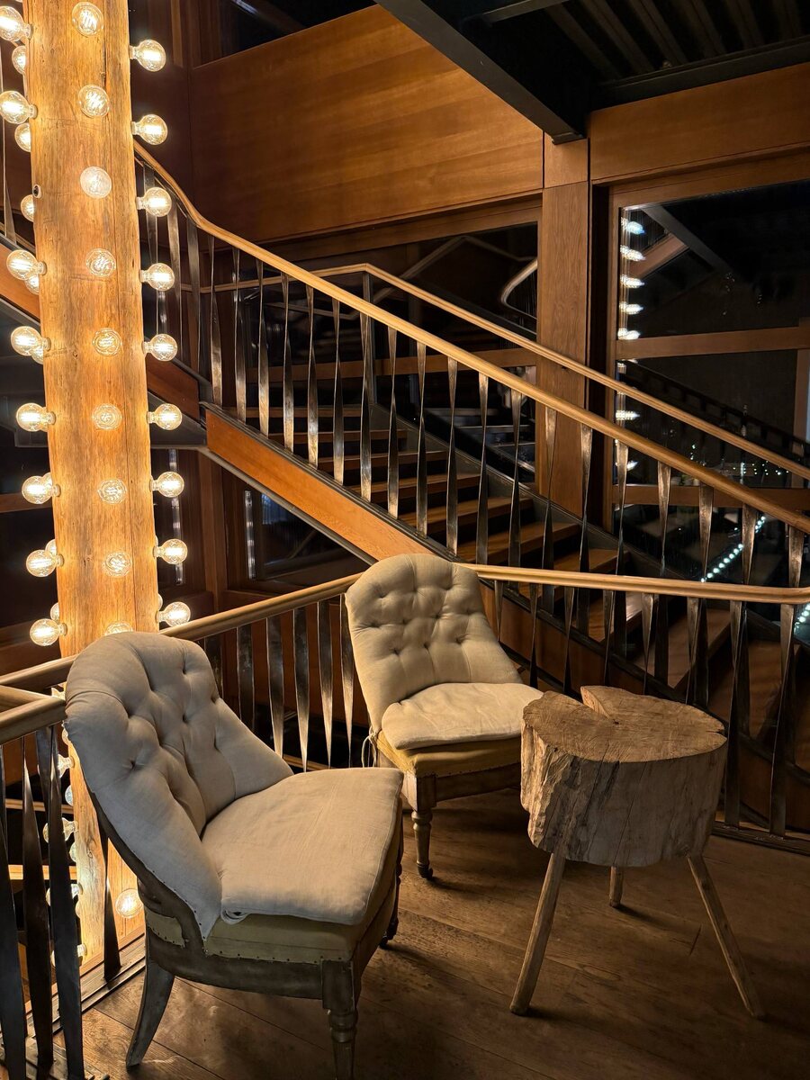 Отреставрированное старое здание, мебель и отделка в одной цветовой гамме, много дерева, большие панорамные окна. С тех пор в интерьере мало что изменилось.