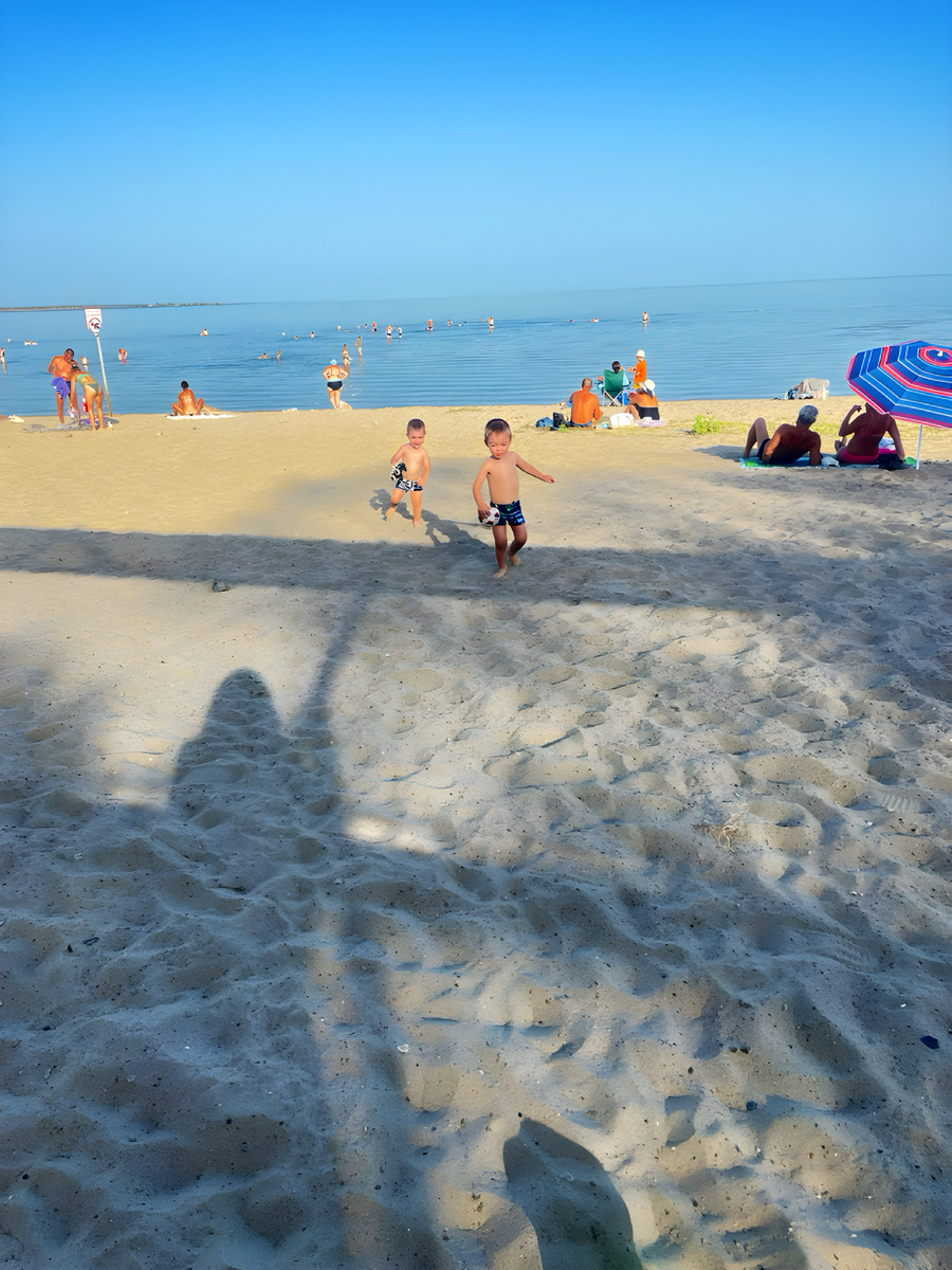 В последний день лета мы всё-таки решили выйти к морю)) Ну как решили… решила я, а детям оставалось только подчиниться 🤣 Погода стояла жаркая, ветра не было — в общем, условия идеальные. Казалось, что могло пойти не так? А «не так» началось ещё дома. Планировали идти после дневного сна детей. Малыши уснули, но через полчаса Дима проснулся в слезах. Просто плачет и всё. На мои уговоры, попытки обнять или погладить — только отталкивает. И так почти час. Макс сначала спал, потом ворочался, а в итоге окончательно проснулся. Дневной сон был испорчен. Дима потом успокоился, но у меня уже пропало всякое желание куда-то идти. Тем не менее я взяла себя в руки, мы собрались и двинулись в путь. К морю (с коляской!) можно пройти двумя дорогами: длинной — через мост, или короткой — через ж/д пути. Но лёгких путей мы не ищем, пошли по короткой. Хотя честно говоря, по времени, наверное, одинаково, просто наша дорога оказалась «с уровнем посложнее». Со старшим сыном кое-как перетащили тяжёлую двойную