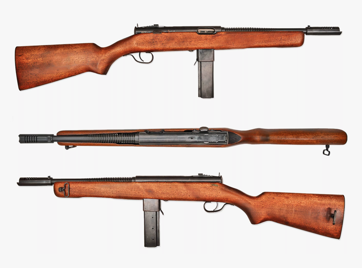 - Механизм: Вместо простого свободного затвора был реализован полусвободный (закрываемый) затвор с интересным решением — для отпирания затвору требовалось немного сместиться вниз, что замедляло его откат и делало стрельбу мягче и контролируемее.