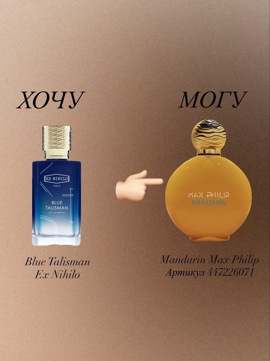 Как звучит. У Ex Nihilo — «голубая чистота»: искристый цитрус, прохлада, прозрачные мускусы и светлая древесная база. У Mandarin Max Philip акцент ещё более солнечный: спелый мандарин, лимонная цедра, немного белых цветов и чистый мускус в шлейфе. Получается жизнерадостная свежесть без горечи.