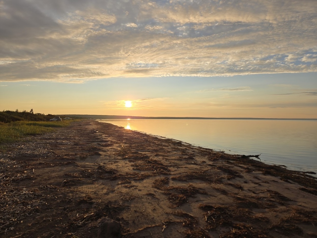 В тот день максимум прилива наблюдался как раз около пяти часов утра. Широкая песчаная литораль, по которой мы бродили с дочкой вечером, была вся затоплена. А лучи утреннего солнышка очень хорошо подсвечивали мыс Носок, находившийся чуть западнее. В ту сторону нам предстояло поехать после окончательного пробуждения.