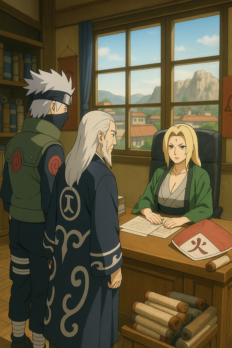 Кабинет Хокаге тонул в золотистом свете заката, пробивавшемся сквозь жалюзи. Он озарял стол, заваленный свитками и недописанными отчётами. Цунаде сидела, опершись локтями о стол, пальцы её мерно постукивали по дереву. Усталость и раздражение боролись на её лице, но она держала себя в руках. Дверь распахнулась с таким грохотом, будто в неё врезался ветер. Вбежал шиноби из Суны — его одежда была изорвана, тело измождено, а дыхание сбивалось, словно он бежал через всю пустыню, не останавливаясь. Руки его дрожали, но он крепко сжимал свиток, будто это было единственное, что удерживало его на ногах. — Хокаге-сама! — его голос дрогнул от напряжения. Он низко поклонился, протягивая свиток. — Срочное донесение от Казекаге! Цунаде резко выпрямилась. Мгновенно развернув свиток, она стала читать, и её лицо мрачнело с каждой строчкой. — Пространственное дзюцу, — прочла она вслух, голос её был холодным и отстранённым. Её глаза сузились. В них загорелась решимость. — АНБУ! — властный и жёсткий голо